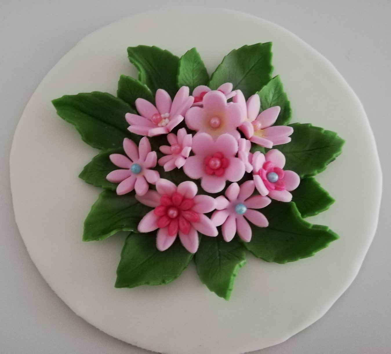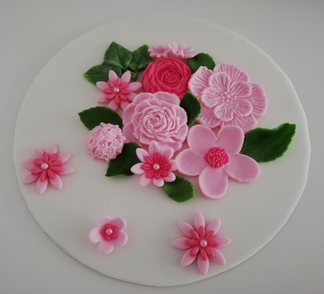 Zu beachten ist lediglich, dass ich Rollfondant und Blütenpaste je zu 50% gemischt habe, um mehr Festigkeit und Elastizität zu erhalten und die Formen vor dem Zugeben des Fondants mit Speisestärke bestäubt habe. Das Fondant habe ich mit Gelfarben eingefärbt und auf einige Blümchen ein wenig Puderfarbe gegeben.